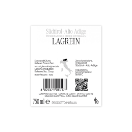 With its full-bodied, powerful, and rich flavor, this black-red Lagrein is part of the top-quality Sanct Valentin line. It has aromas of coffee, cocoa, and forest fruits.