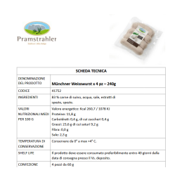 Insaccato in budello naturale e cotto delicatamente al vapore. Prodotto artigianalmente con carne fresca selezionata senza esaltatori di sapidità, fosfati, lattosio o latte in polvere. Sapore: deliziosamente fresco e aromatico.